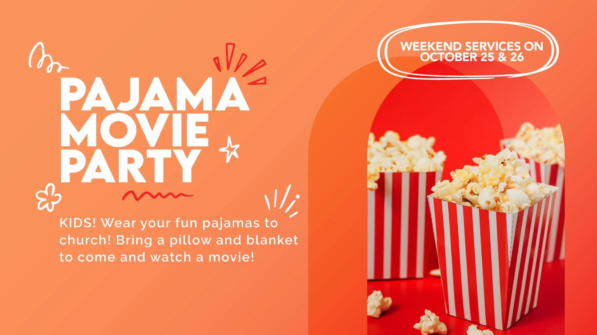 Kids, wear your pajamas to church! Bring a pillow and blanket and join us for movie night on the weekend of October 25-26.