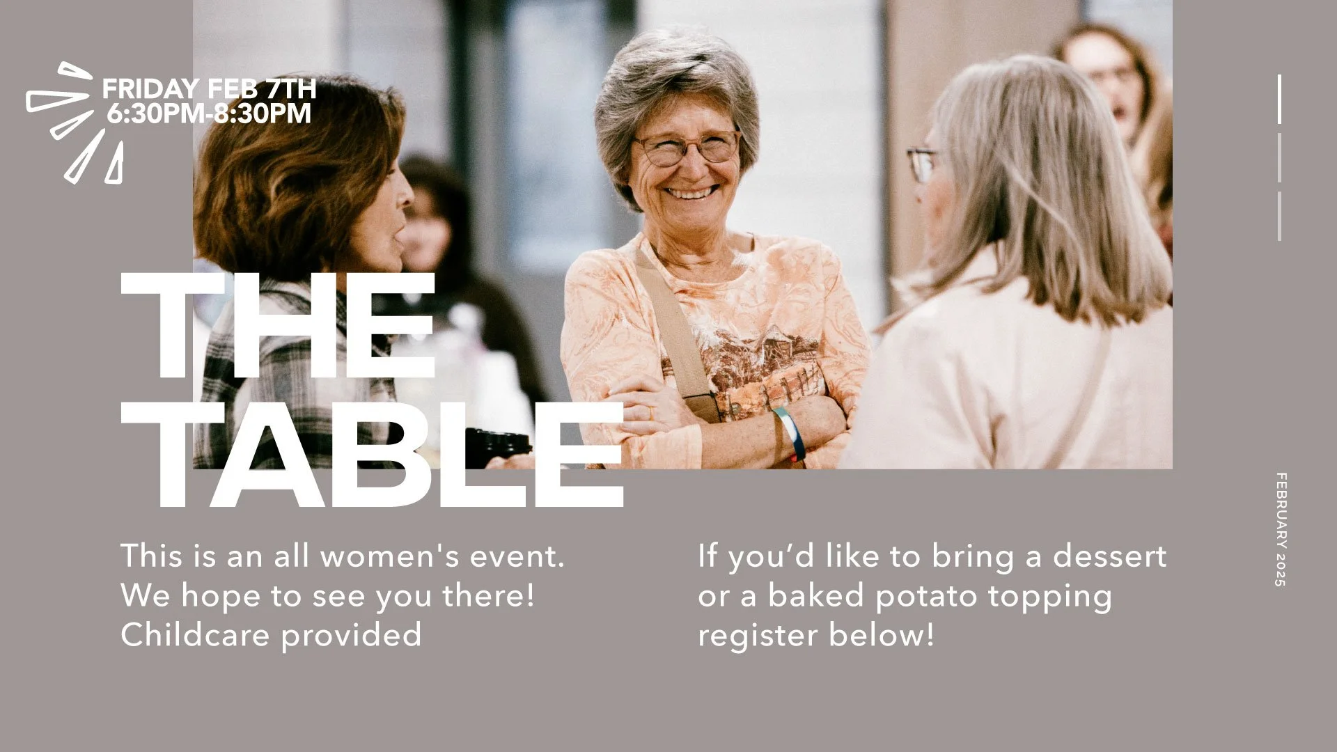 Women, join, us for The Table on Fri., Feb. 7, from 6:30-8:30 p.m., in Life Community Church's Building B, 2140 Broadway.